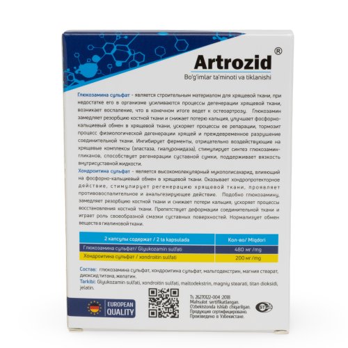 Glucosamine sulfate is a building material for cartilage tissue, with a lack of it in the body, the processes of cartilage tissue degeneration intensify, inflammation occurs, which ultimately leads to osteoarthritis. Glucosamine slows down bone tissue resorption and reduces calcium loss, improves phosphorus-calcium metabolism in cartilage tissue, accelerates its repair processes, inhibits the process of physiological cartilage degeneration and premature destruction of connective tissue. It inhibits enzymes that have a negative effect on cartilage complexes (elastase, hyaluronidase), stimulates the synthesis of glucosamine glycans, promotes the regeneration of the articular bag, and maintains the viscosity of the intraarticular fluid.